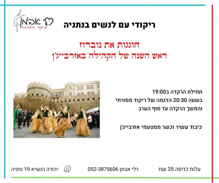 לכבוד יחסי אזרבייג'ן-ישראל, עורך המרכז הכלכלי לשלום, יחד עם להקת הרקדניות הישראלית "רלי אבמן", את "מסיבת נורוז לנשים". המסיבה תתקיים ב-27 במרץ בשעה 20:30, בקהילת בית ישראל בכתובת יהודה הנשיא 19, נתניה, ישראל. במהלך החגיגה תסביר רייצ'ל אברהם, העורכת של המרכז הכלכלי לשלום, מהו חג הנורוז; זיווה אמארוב תלבש בגדים אזריים מסורתיים ותלמד את הקבוצה לרקוד ריקודים אזריים; אוכל אזרי מסורתי יוגש לאורחים יחד עם בירה, יין וכיבוד נוסף. נשים מוזמנות להשתתף בחגיגה.